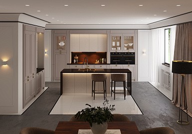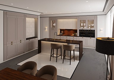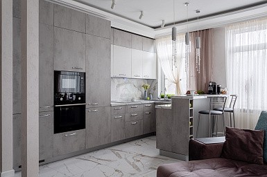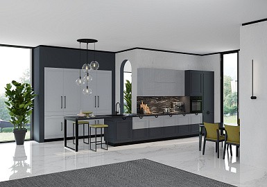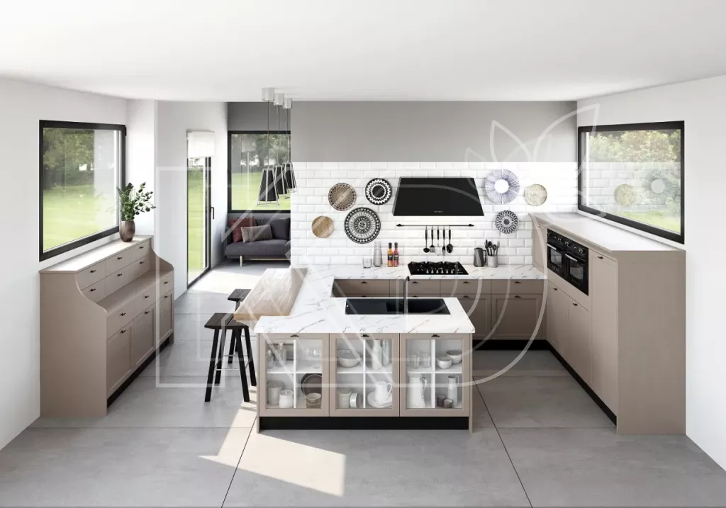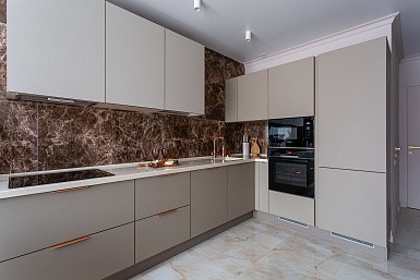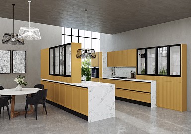 П-образная форма, наоборот, потребует большой площади. Данную конфигурацию обычно выбирают для загородных домов и просторных студий. Шкафы в этом случае устанавливают вдоль трех смежных стен. Преимуществом таких комплектов является вместительность, большое количество рабочих поверхностей и соблюдение правила рабочего треугольника.