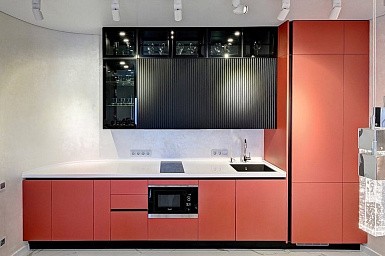 Для просторного помещения можно купить кухню в более насыщенной цветовой палитре. Например, для комнаты, расположенной на северной стороне подойдет модель в более ярких тонах – красных, оранжевых, салатовых, желтых или фиолетовых. В пространство с хорошим дневным освещением удачно встроится коричневая, бордовая, вишневая или темно-синяя версия.