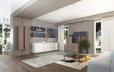Фасады такой мебели выполняют в белых, светло-серых, бежевых, голубых, розовых, оливковых оттенках. Более темные расцветки используются для отделки столешниц, открытых полок, цоколей.