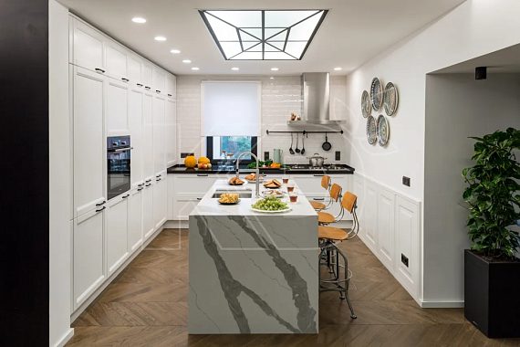 При выборе светлого гарнитура с островом предпочтение следует отдать моделям с простыми формами без лишнего декора. Такая мебель смотрится в пространстве более гармонично, не перегружая его.