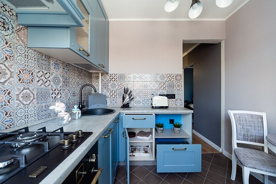– «И это маленькие кухни?!», – спросит кто-то. Да! П-образный гарнитур вполне реально вписать в ограниченное пространство, если за дело берутся профессионалы. При этом такая кухня будет даже удобнее Г-образной, так как в неё может поместиться намного больше полезных аксессуаров.