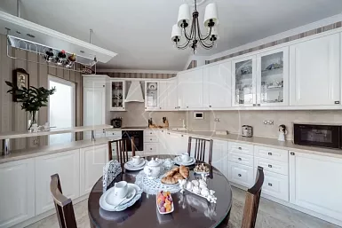 Для большей вместительности верхний ряд модулей белого комплекта делают двойным. В шкафах под потолком хранят банки для солений, праздничные сервизы и другие предметы, которые не требуются для ежедневного пользования.