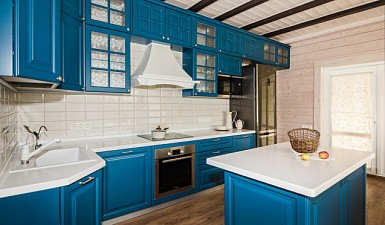 • Более авангардные решения, в которых на фасадах мебельного гарнитура применяются вставки из натурального дерева или белые блоки – смотрятся более свежо в любой обстановке вне зависимости от степени освещенности. Они понравятся почитателям стилей прованс, эклектика и модерн.