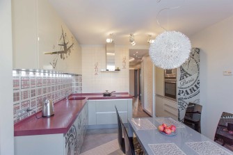 В первом случае выбранный рисунок печатают на тонкой пленке, обратная сторона которой покрыта клеевой основой. Затем ее аккуратно крепят на фасад гарнитура. Такой способ изготовления мебели достаточно экономичен, однако в будущем кухня потребует аккуратного ухода – если вы случайно зацепите пленку, она может отклеиться с фасада.