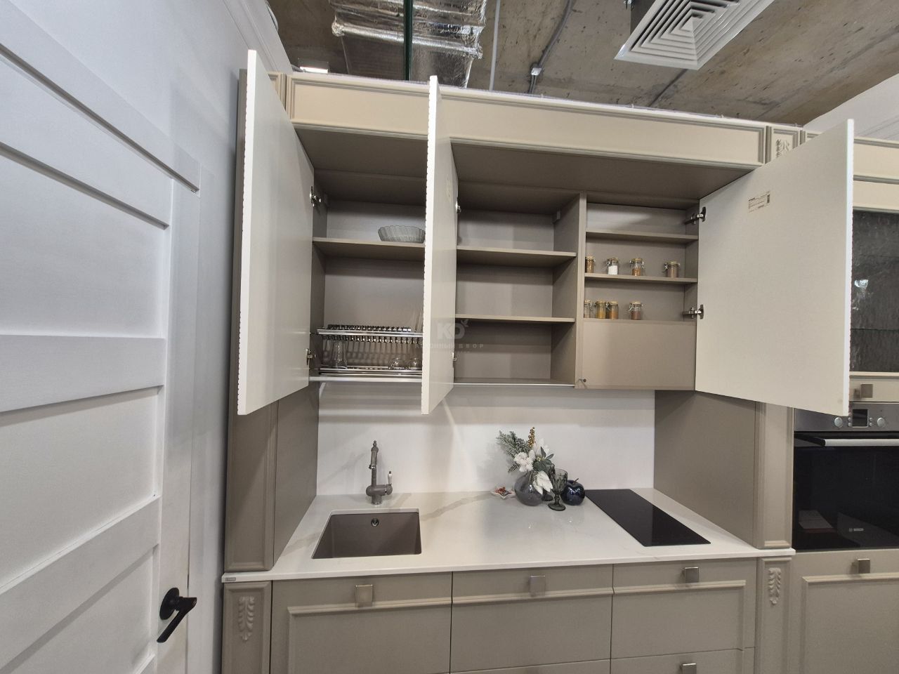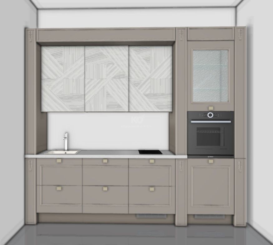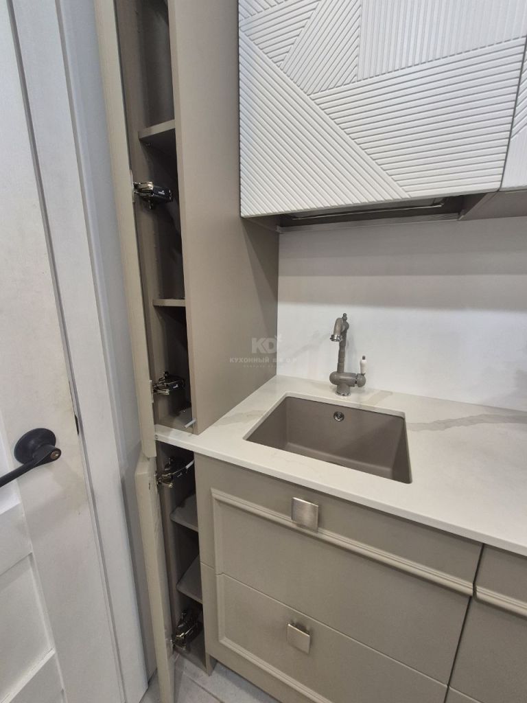 В стоимость образца включена: мебель (корпус Egger, фурнитура Hettich), столешница, мойка подстольного монтажа, смеситель.