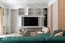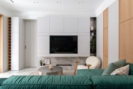 Теперь о гостиной! Она создавалась на основе модели «Фаворит» и имеет фасады, каждый из которых открывается лёгким нажатием при помощи системы «Tip-On». Деление фасадов по горизонтали соответствует расположению панелей на стенах, а ниша под ТВ-зону оформлена чёрным цветом, что делает телевизор практически незаметным. Стильный мини-камин довершает образ интерьеров, в которых красота юга и севера пребывают в идеальной гармонии!