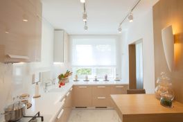 Кухню героев маленькой не назовешь. Здесь – 10 м2. Но раньше пространство было спланировано нерационально – рабочая зона располагалась в темном углу, и хозяйке негде было развернуться во время приготовления многочисленных блюд. К тому же здесь совершенно не хватало мест для хранения. Эту неудобную ситуацию дизайнеры изменили в корне. Выстроили гарнитур буквой «Г» – продолжили рабочую зону вдоль всей стены и задействовали все пространство под окном прилегающей стены. Корпуса шкафов изготовлены из ламинированной ДСП белого цвета, а фасады – из покрытой шпоном МДФ цвета выбеленного дуба.Вся рабочая зона кухни накрыта столешницей из искусственного камня Montelli белого цвета с небольшими вкраплениями «снежинок» – белых камушков. За счет такой пестрой расцветки удалось визуально скрыть места стыков полотен столешницы. Под окном установили интегрированную бесшовную мойку из того же материала. Такая конструкция очень удобна, поскольку ее легко чистить, а грязь не забивается в стыки.При конструировании гарнитура из внутреннего объема столов «выжали» максимум – не пропало ни миллиметра. Основные системы хранения, которых раньше было явно недостаточно, разместились в нижнем ярусе. К оптимизаторским решениям относится, в частности, трехсекционный выдвижной ящик, все секции которого расположены за одним фасадом. Верхнее отделение для вилок и ложек снабжено специальной «ручкой-поводком». Если ее нажать – маленький ящик откроет доступ к двум другим ящикам, которые расположены под ним.В углу нижнего яруса смонтирована система с выдвижными сетками в виде «восьмерки», которая позволяет максимально функционально задействовать «мертвый» угол. Полки могут полностью выдвигаться из шкафа и загружаются сверху. К тому же уровни системы двигаются независимо друг от друга.Верхний ярус гарнитура расположен только вдоль боковой стены кухни. В навесных ящиках находятся многочисленные полки – сушки расположены в нижнем ярусе, справа от мойки. Видимые боковины шкафов выполнены из фасадного полотна. При этом их лицевые панели шпонированы, а боковые панели выполнены в цвет столешницы.
